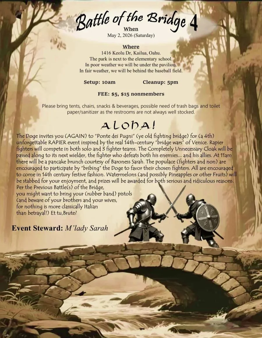 OCHS will be attending the annual SCA Battle of the Bridge in Kailua. The cost is $5 for SCA members, $15 for non-SCA members. Fighters must be SCA rapier certified prior the event if they expect to compete. Certifications will be happening on Sundays between now and the event.